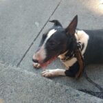 Sam or Sammy as he is affectionately called has been through lots of change in his life. We first learned about him in June when we were contacted by a director of a shelter in Michigan. She told us that Sam, along with several other dogs, were seized in March from a backyard breeder for neglect. The dogs spent most of their time in crates in an unheated building with no running water. In spite of how sweet Sam was, they were having difficulty finding the right home for him. We were told he was very mouthy so we initially set things up for him to go to a foster, who had previously worked with a mouthy bull terrier and had done wonders. However, shortly after going there, it was evident that things had changed in the foster’s home since the last foster was there and it wasn’t working. We scrambled around and were lucky enough to have Sharon Whalen-Keillor of Key-Lore Kanine Kountry Klub and Doggie Day Care make space to have Sammy go to her for board and train. Sammy learned so much while with Sharon including how to be a good citizen. Our plan was to then have him go to Diane Thomas’s home for a short while as a foster just so he was in a home setting prior to going to a permanent home because Sammy has never actually lived in a home. Diane had spent some time with Sammy while he was at Sharon’s and was going to continue working on his training. However, our plans hit a snag when poor Diane blew her knee out a little after Sammy went to her. He went back to Sharon’s and we started to look for a furever home for Sammy. After we posted him, we were contacted by a woman who was his original breeder and subsequently spoke with his co-breeder as well. We learned that Sammy was not actually 5 years old but that he will be 2 years old in September, which helped explain some of his behaviors more so. We also were contacted by a woman named Dania who was interested in possibly bringing Sammy home. Once we spoke with her and her husband Stuart, we felt we had the perfect home for Sammy. They have lots of bull terrier experience and have dealt with the full gamut of bull terrier antics, quirks and issues. They have a teenage son who has grown up with bull terriers and absolutely loves them. Once decompressed, Sammy will also have a 4 legged brother named Eric. Today, Sammy started what we hope will be the final stage in his journeyed young life, a permanent home with a lovely family.