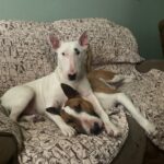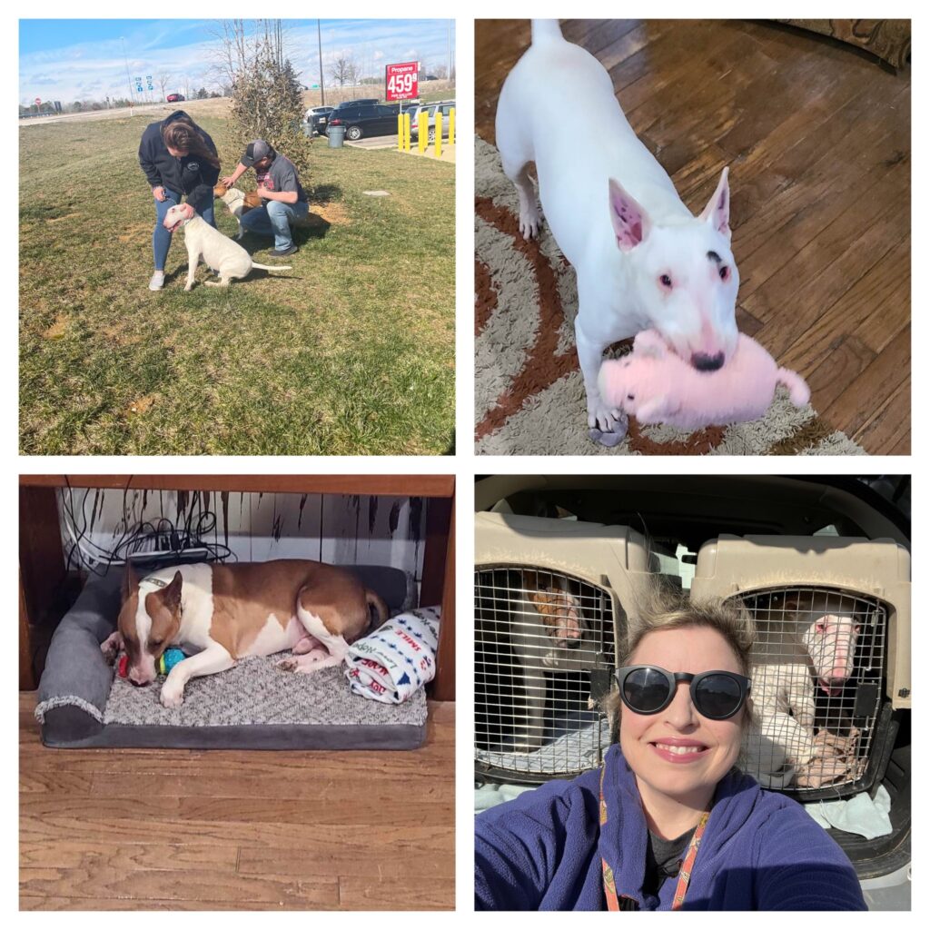 We learned about Frank and Egg, a bonded pair, in January. The story we were told by the gentleman who wanted to re-home them was that he got divorced a few years ago. His ex-wife was the one who had purchased both bullies but when they separated, he ended up taking them. He said that he had them for the last 2 years on his own and that he didn’t have any time for them. He mentioned that he had a “roommate” who also had a dog and that Frank and Egg were good with that dog. We had the dogs evaluated and during that time, it became apparent that Frank and Egg spent a huge amount of their time in a crate and/or segregated from the humans in the home. It appeared to us that the “roommate” was into her own dog and not Frank and Egg so they needed to go. We thought we had a home lined up for them pretty quickly but following a home check, we changed our minds. We looked through all the messages we had received about Frank and Egg and for some reason, one caught our eye, a message from a man named Charlie (also known as Bubba). After talking further with Bubba, we learned that he and his wife Melissa had lost their bull terrier Stella fairly recently. It was the first time in decades that they didn’t have a dog in the home. It turned out that, unbeknownst to both of them, they had each separately seen the post on Frank and Egg and had some interest in them but were unsure if the other was ready to open their heart and home to another bully (or two) quite yet. Luckily for Frank and Egg, they were both on board. These two bullies have been starved for attention and love, something that bull terriers typically thrive on. In their new home, they will be with a human almost every hour of every day. We can’t change their past but we can try to make up for it from here on out. Yesterday, they made their way to their way home. They have been settling in and soaking up all the love, enjoying toys and playtime, taking walks and exploring their big back yard.