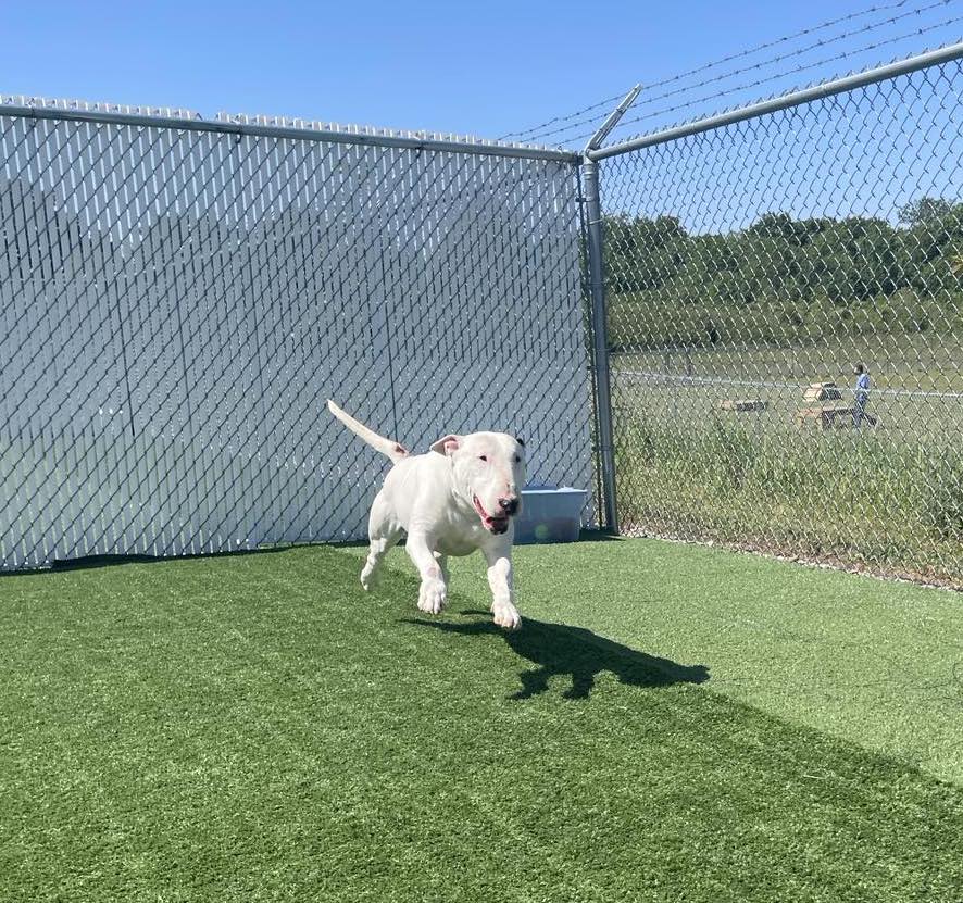 Kaiser is a 3 year old male bull terrier who was picked up as a stray and so far, has not been claimed by his owner. If he is not picked up by his family when his stray hold ends a week from today, Friday, June 2nd, 2023, we will have to get him out of the shelter pretty quickly after that as they are full. Kasier was very happy to just jump into the woman’s vehicle who found him as if he had known her forever. He has been very friendly thus far. He is a big boy, weighing about 67 pounds and he is a puller on the leash so whoever he goes too needs to be able to handle a young, energetic bull terrier of his size. He also likes to lean in on you with all his weight! The shelter can’t do any kind of dog test until after his stray hold is up but we have to pull him after the stray hold is up so we are not sure how he will be with another dog. While being evaluated outdoors today by a friend of the rescue, while outside they saw other dogs through the fence and he seemed interested to see what was going on, he didn’t show any aggression. When they went to walk back inside, they passed by several dogs through a fence and he didn’t react. We would be willing to send him to a home with a female dog who is close in Kaiser’s size or bigger but slow integration would have to take place and you’d have to be willing to keep them separate if he ended up not being okay with the dog so that we could continue to learn more about him while in his foster home. Ideally, there would be a fenced in back yard because he is so strong but if you know how to work with a bull terrier and get them to stop pulling on walks, a fence isn’t a dealbreaker. He does have a wound on his tail and a few other things going on that we would want to have addressed by the vet and we would cover those costs. He keeps his kennel clean and waits until taken outside to go potty. The general consensus is that he is a big love of a bull terrier. Since we have no background information on Kaiser, kid 12 and older. No cats or smaller animals. If you live within 6 hours of Elkhart, IN and are interested in fostering Kaiser, please either message our main inbox or Lisa Taubman Blount directly.