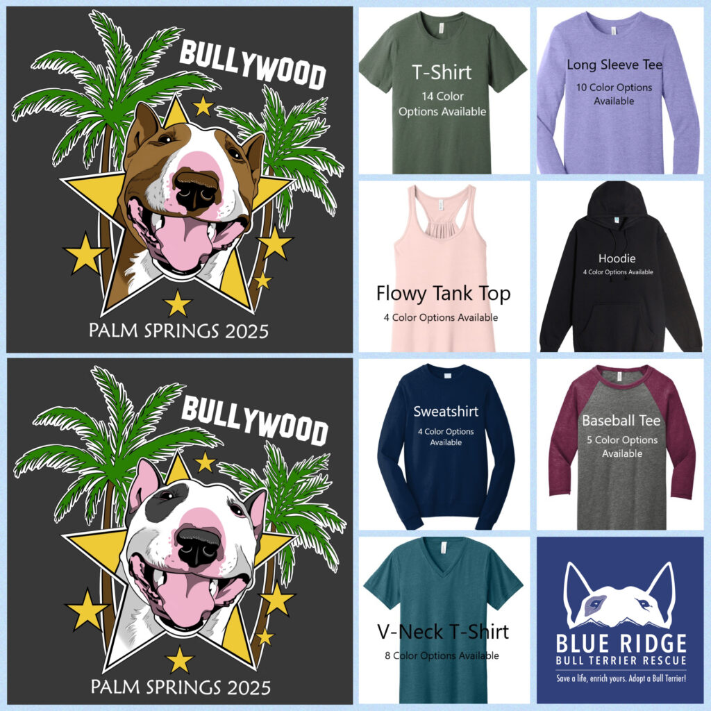 Our gorgeous LIMITED EDITION clothing for Silverwood/MBTCA Nationals 2025 is here! This year’s events will be held in Palm Springs, CA between October 25 – November 2, 2025. Blue Ridge Bull Terrier Club Rescue will have a booth set up, but since a lot of our East Coast followers will not be able to visit us, we are offering a presale on our annual design, which has been created by the ultra-talented artist Brielle Pollock. The presale includes the option of a RED Bull Terrier or a WHITE Bull Terrier on 7 different shirt styles, available in a variety of colors and sizes. You may choose to have the shirts shipped to you in advance (shipping tentatively starts the first week of October) or if you will be attending the shows in California, you can pick up directly from us at no additional charge. Please make sure to choose the desired option at checkout.